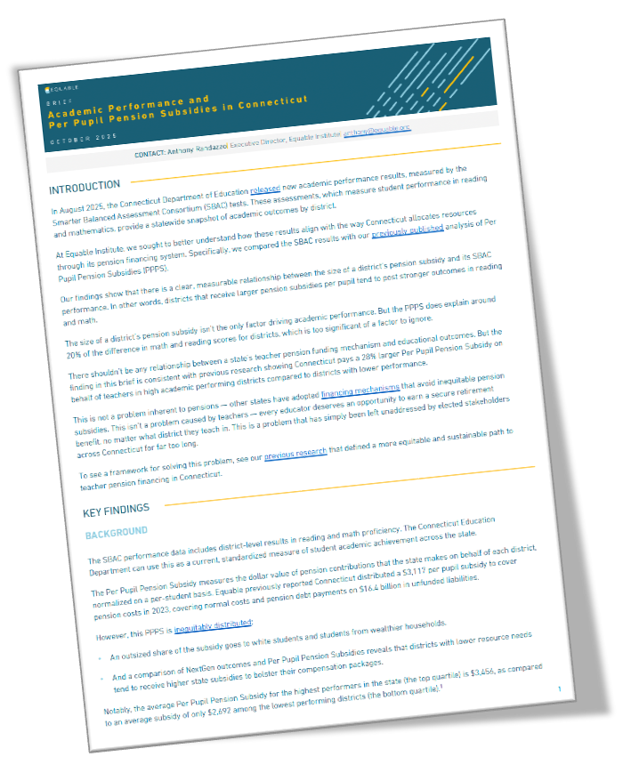 Equable Institute released a new brief showing that differences in state support for teacher pension costs in Connecticut are correlated with differences in student performance across district lines. Districts that receive larger pension subsidies per pupil tend to post stronger outcomes in reading and math, the analysis finds.